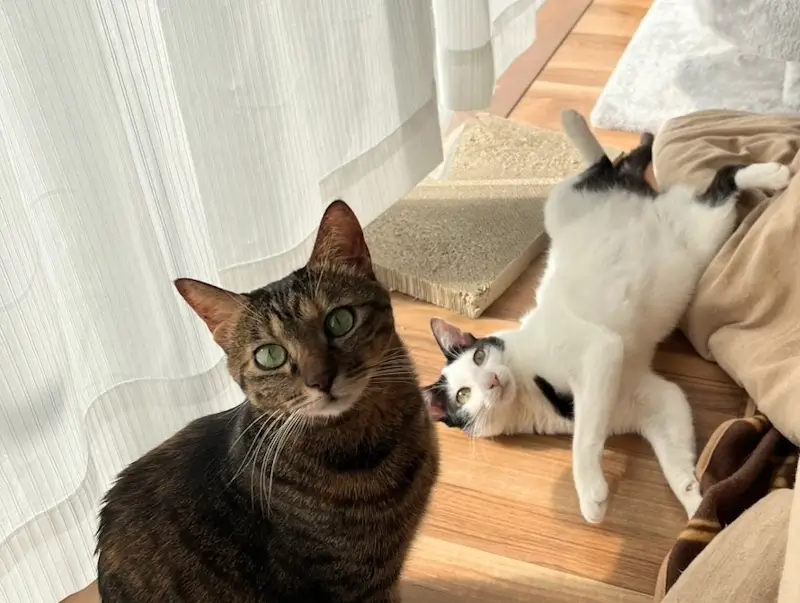 ミコは私が寝る前に「ニャアー」と鳴いて、家の中を一緒にうろうろさせます。ミコとコトが夜中にドタバタと走り回ることも。2匹で遊んでくれる分にはまだ楽なほうです。